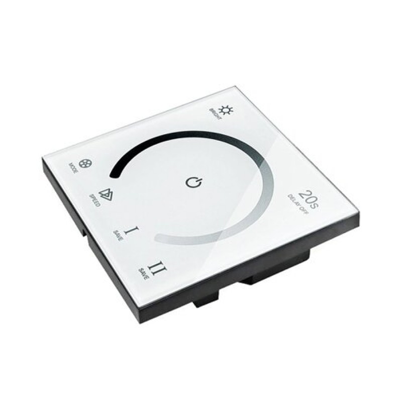 Димер OEM 8A-Touch-W використовується для плавного регулювання яскравості світла монохромних світлодіодних стрічок. Він виконаний у корпусі білого кольору та має регулювальне кільце з сенсорним управлінням на фронтальній панелі. Тип монтажу пристрою – вбудовуваний, пульт ДУ у даній моделі не передбачено.