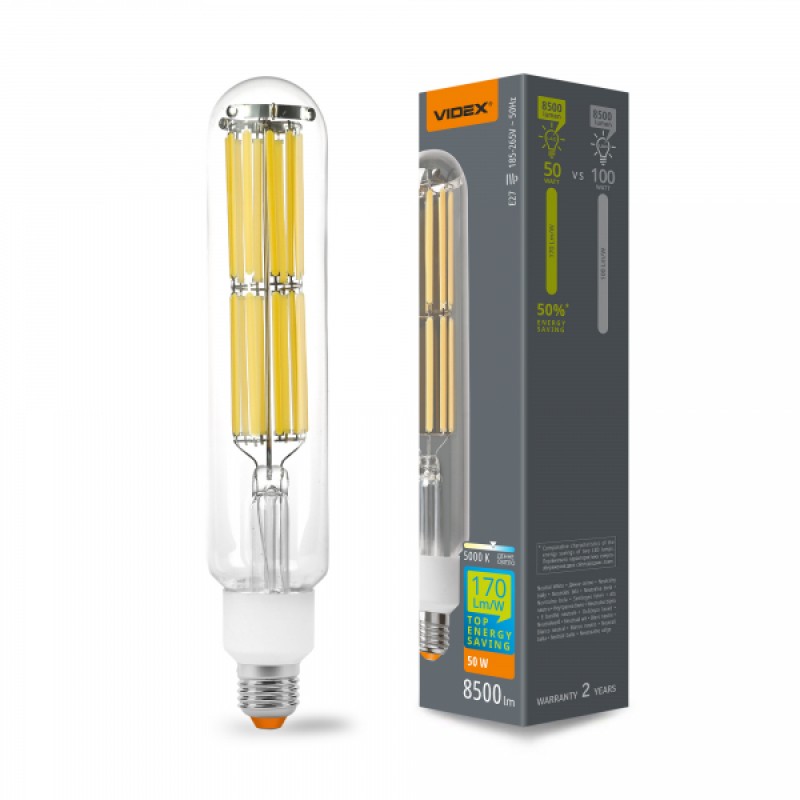 Високопотужна LED лампа VIDEX Filament T52F 50W E27 5000K забезпечує рівний світловий потік і максимальну яскравість з першої секунди роботи. Дана модель є високоефективною, адже навіть у порівнянні зі звичайними світлодіодними лампами вона має кращу світловіддачу і меншу потужність, тому і є ефективніша. Завдяки використанню такої лампи ви зможете додатково заощаджувати на витратах електроенергії.